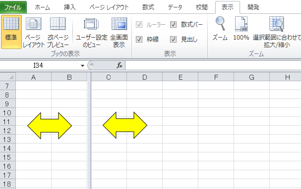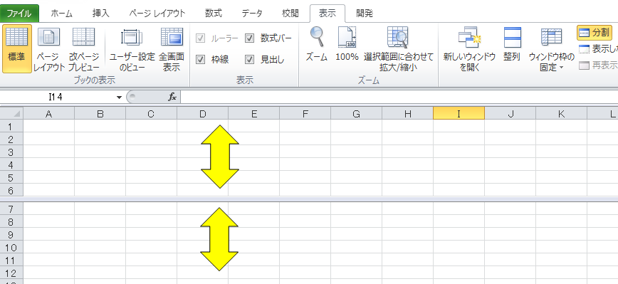 エクセルの画面を上下左右に分割する方法です。