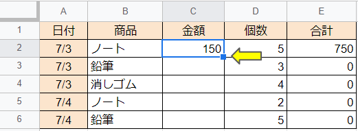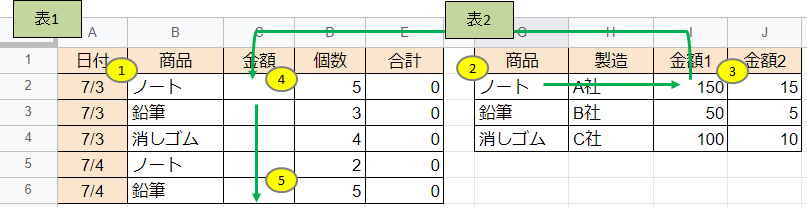 2.C2からC6まで下に数式のコピーを行うと、表2の「ノート」、「鉛筆」、「消しゴム」の商品ごとの金額が表1の商品にあわせてC列にセットされます。