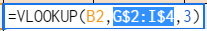 2.=VLOOKUP(B2,G2:I4,3)の「G2:I4」を選択し、F4を2回押すと