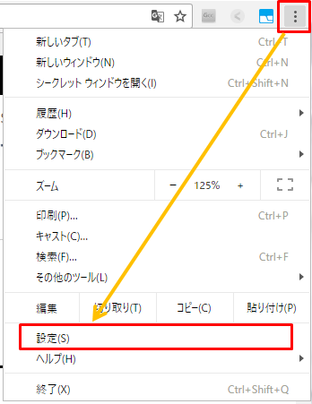 1.ブラウザの右端にある箇所をクリック>「設定」をクリックします。