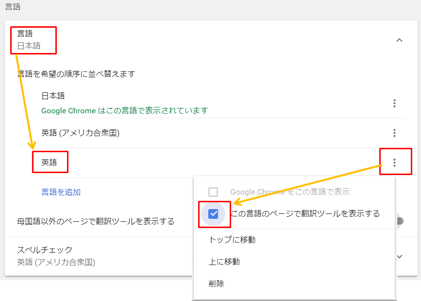 5.英語の横の印をクリックして、「この言語のページで翻訳ツールを表示する」にチェックを入れます。