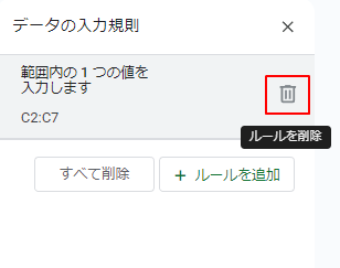 1.「データ」→「データの入力規則」をクリックし、不要なルールの箇所でゴミ箱のアイコンをクリックするとルールが削除されます。※選択した値は削除されません。