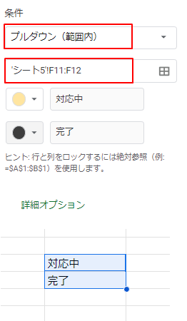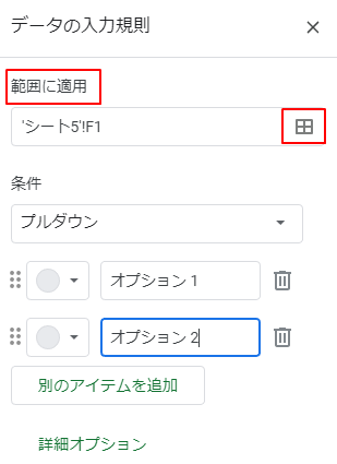 1.「条件」を「プルダウン(範囲内)」を選択すると、その下でシートの箇所を指定できます。