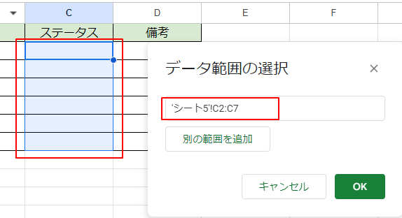 4.プルダウンを指定したいセルを選択すると、自動でデータ範囲の値がセットされます。