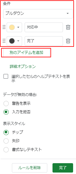 5.「条件」をプルダウンにして選択する値を入力します。「別のアイテムを追加」で行を追加できます。完了ボタンを押すとシートに反映されます。