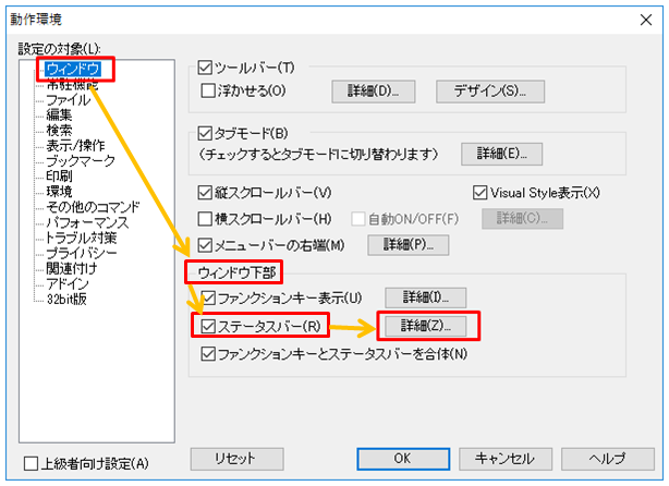 2.「ウィンドウ」を選択し、「ウィンドウ下部」の「ステータスバー」にチェックを入れ、「ステータスバー」の横にある「詳細」を押します。