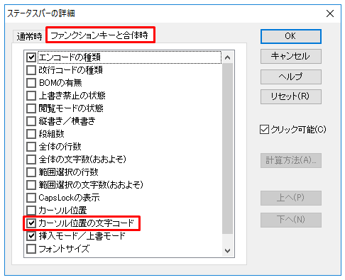 3.「ファンクションキーと合体時」タブで「カーソル位置の文字コード」にチェックを入れOKを押します。カーソル位置の文字コードが表示されるようになります。