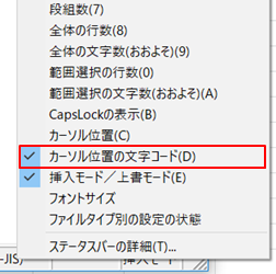 2. 「カーソル位置の文字コード」をクリックしてチェックを付けると、カーソル位置の文字コードが表示されるようになります。