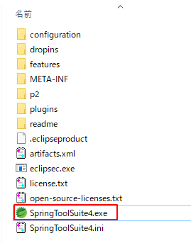 1.sts-4.10.RELEASEフォルダの中のSpringToolSuite4.exeをダブルクリックして起動します。