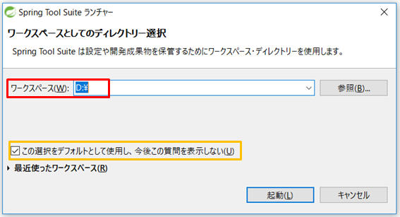 下図のオレンジ枠にチェックを入れると次回のSTS起動時にこのダイアログは表示されなくなります。