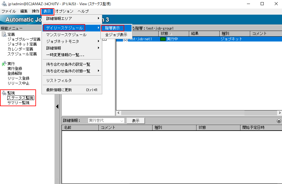 1.監視のステータス監視をクリックし、表示>デイリースケジュール>階層表示をクリックします。