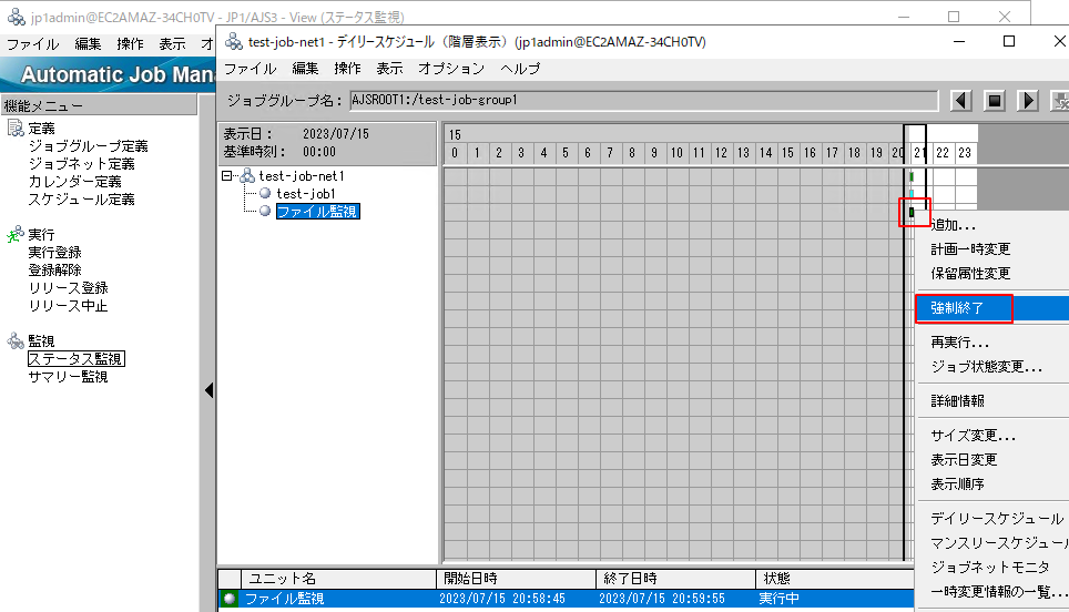 2.対象のジョブネットを右クリックし「強制終了」をクリックします。