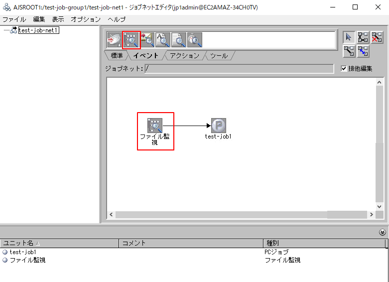 1.ジョブネットエディタで「イベント」の「ファイル監視」のアイコンをセットします。