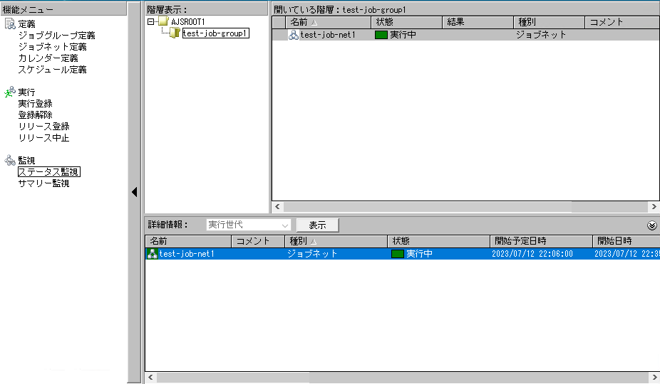 1.機能メニューで「ステータス監視」を選択し中央の「表示」ボタンを押して下の枠にジョブネットを表示します。