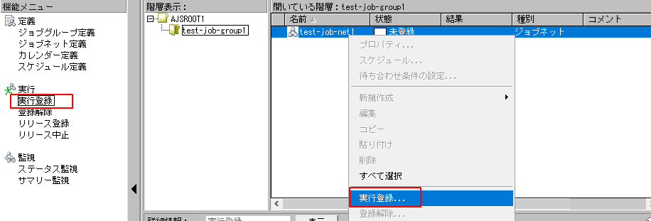2.機能メニューで「実行登録」を選択しジョブネットを右クリックして実行登録をクリックします。