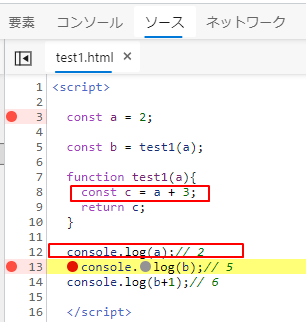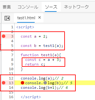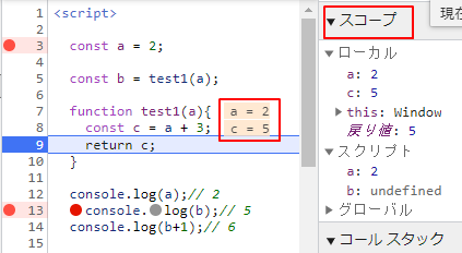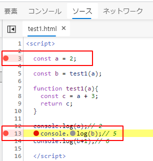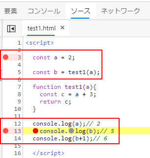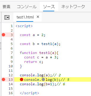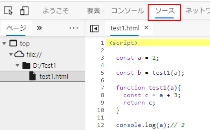 5.ブラウザを再読込してJavaScriptを実行するとブレークポイントで処理が止まります。