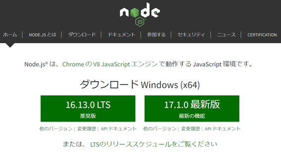 1.以下のNode.jsのサイトからインストーラをダウンロードします。