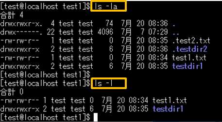 図の下段のls -lでは、隠しファイルと隠しディレクトリは表示されていません。