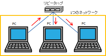 • リピータハブは、1つの機器から受け取った信号をすべての回線に流します。
