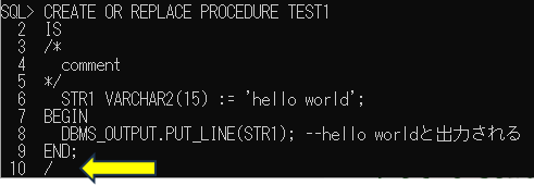 SQL Plusで実行する場合、最終行にスラッシュ(/)を入力します。