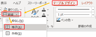 2.「テーブルデザイン」から罫線を選択して格子を選択すると枠線が引かれます。
