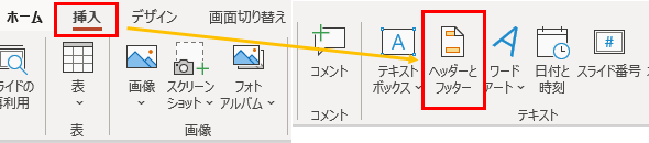 ※ヘッダーとフッターの右にある「スライド番号」でも可能です。