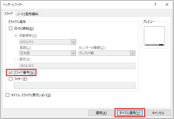 2.「スライド番号」にチェックを入れ「すべてに適用」ボタンを押します。