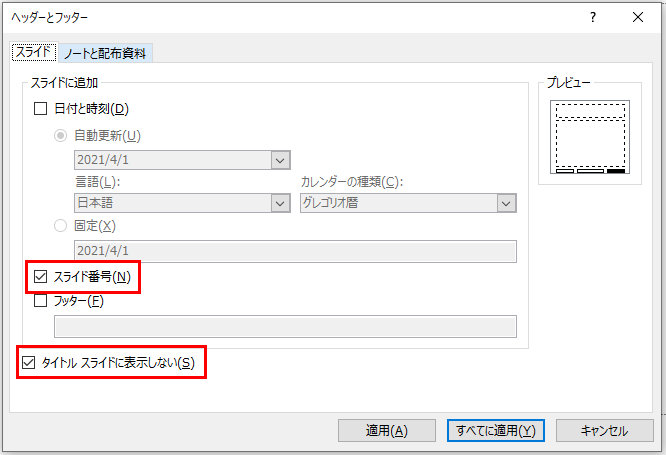 2.「スライド番号」と「タイトル スライドに表示しない」にチェックを入れ「すべてに適用」ボタンを押します。