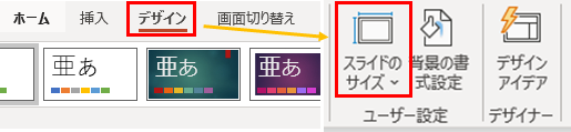 1.「デザイン」→「スライドのサイズ」をクリックします。