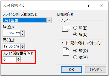 3.「スライド開始番号」を0にすると2ページ目のページ番号が1になります。