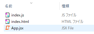 同じフォルダ内にApp.jsxとindex.jsとindex.htmlがあります。