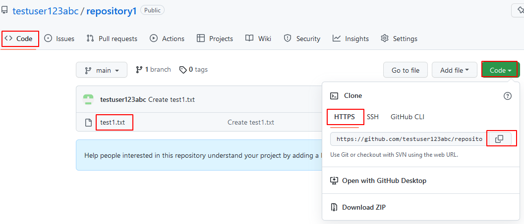 repository1はpublicで、test1.txtファイルがひとつあります。