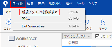 2.SourceTreeでファイル>新規/クローンを作成するをクリックします。
