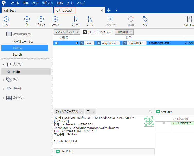 4.上記で指定した「githubtest」タブにGitHubの内容が作成(クローン)されました。