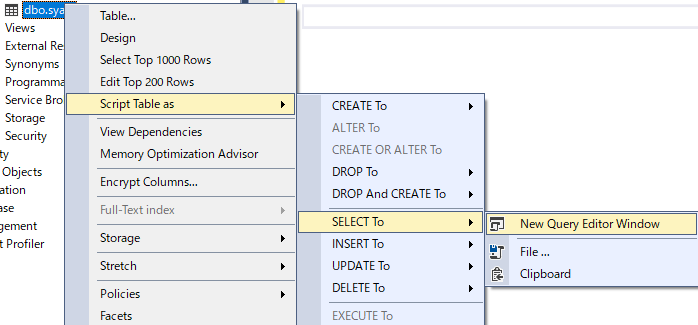 テーブルを右クリックし「Script Table as」から「○○○○ To」>「New Query Editor Window」で新しいWindowが開きSQL文が貼り付けられます。