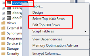 Select top 1000 rowsは先頭から1000行のデータを表示します。Edit top 200 rowsは先頭から200行で修正できます。