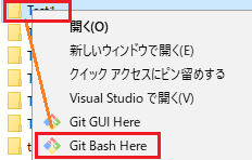 フォルダを右クリックして「Git Bash Here」をクリックするとそのフォルダでGit Bashが起動します。サンプルではEドライブのTest1フォルダでGit Bashを開きました。