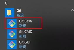 スタートメニューからGit→Git BashをクリックするとGit Bashが立ち上がります。