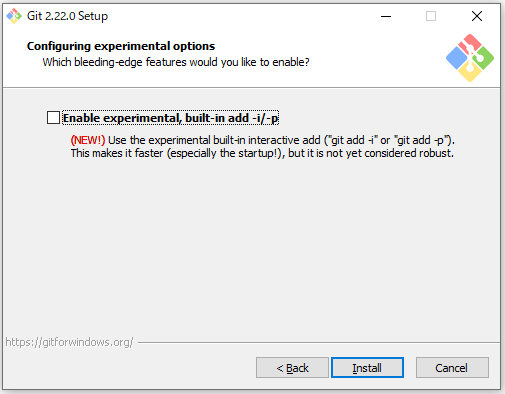 11.実験的なオプションです。デフォルトのままInstallボタンをクリックしました。