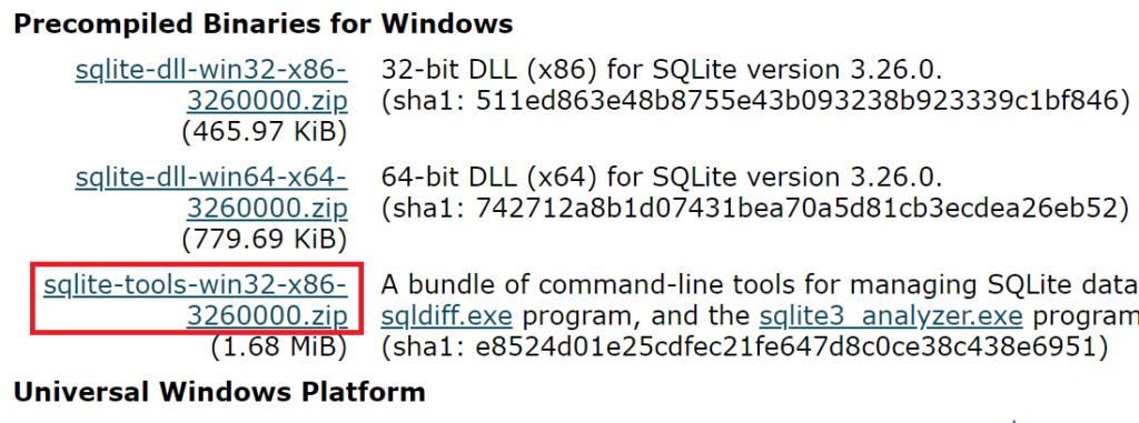 「sqlite-tools-win32-x86-3260000.zip」をクリックしてzipファイルをダウンロードします。