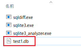 上記手順で作成したデータベース名のtest1.dbというファイルが作成されています。