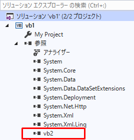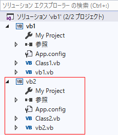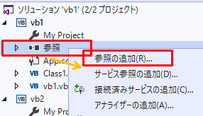既存プロジェクト(vb2)を追加しClass1.vbからClass2.vbのコードを使用できるようにします。