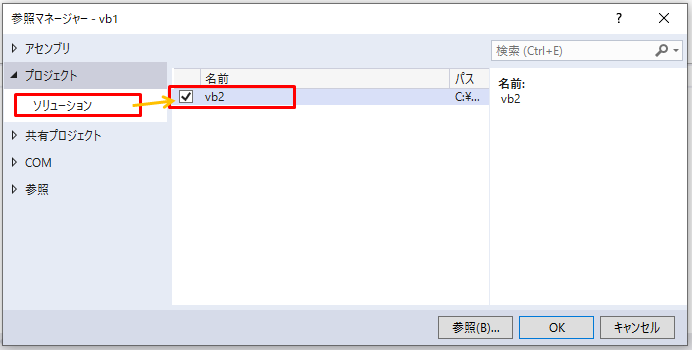 2.プロジェクトのソリューション→参照したいプロジェクトをチェックしOKボタンを押します。