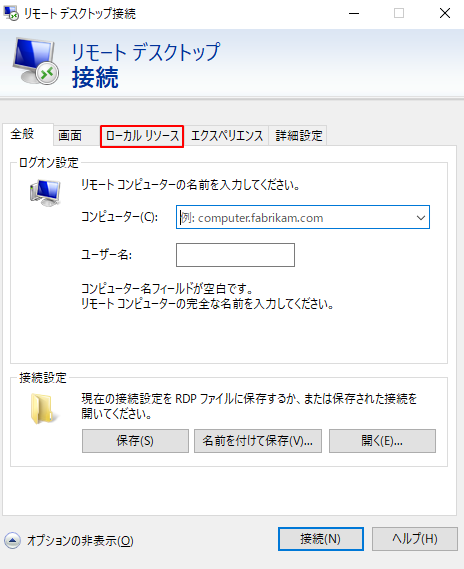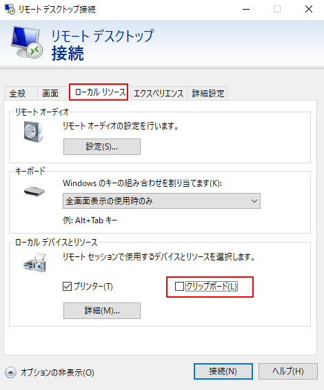 3.リモートデスクトップ接続の「ローカルリソース」の「クリップボード」のチェックを外すとローカルとリモートデスクトップ間の文字列のコピーとファイルのコピーはできなくなります。