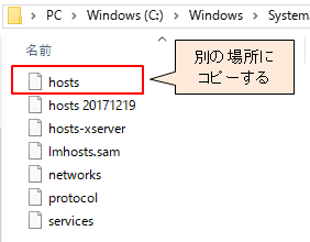 C:\Windows\System32\drivers\etcにあるhostsファイルをデスクトップ等の別の場所にコピーして、そこで修正して保存します。
