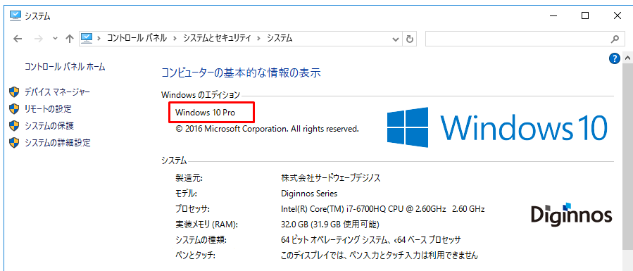 Windows10のProかHomeか確認する方法です。