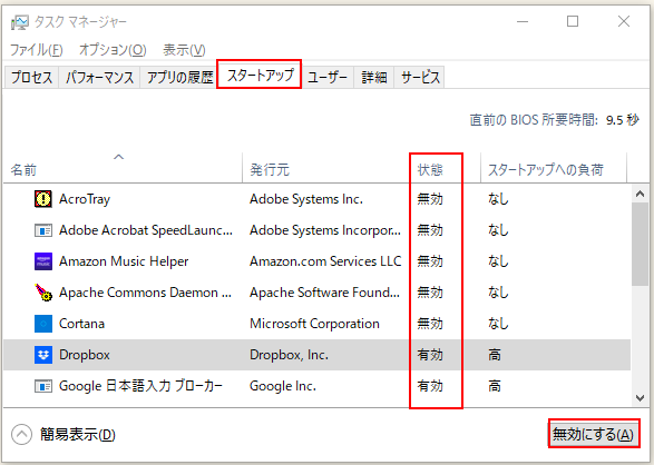 2.スタートアップタブを選択し、停止したアプリを選択して右下の「無効にする」をクリックすると自動起動が停止されます。