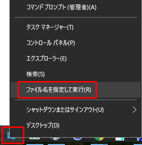 Windows画面の左下にある「スタートボタン」を右クリックして「ファイル名を指定して実行」をクリックします。(または、Windowsキー + r でも開きます。)