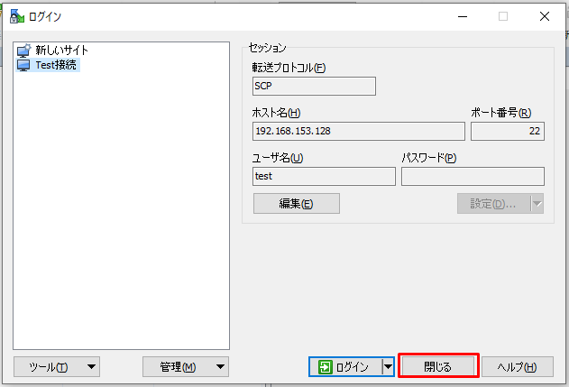2.「閉じる」をクリックするとWinSCPが終了します。