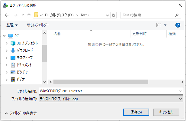 ログのパスは、最初に右側の点々の四角を押します。するとフォルダ選択のダイアログ(以下図参照)が開かれるのでログを配置したい場所に移動し、ログのファイル名をつけて保存ボタンを押します。